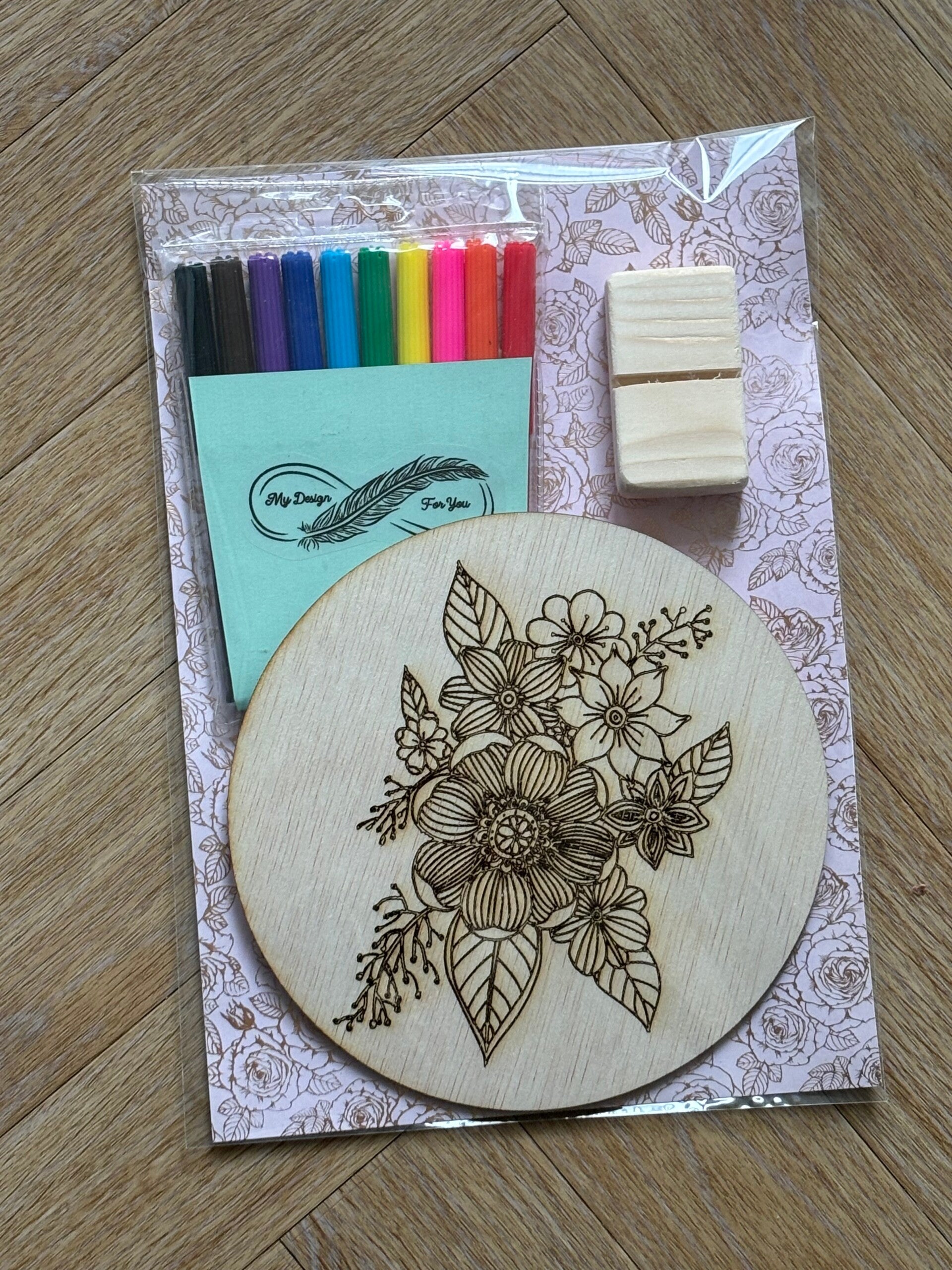 Deze leuke set bestaat uit stiften , een houten kleurplaat en een standaard om je kleurplaat in te showen als deze af is.